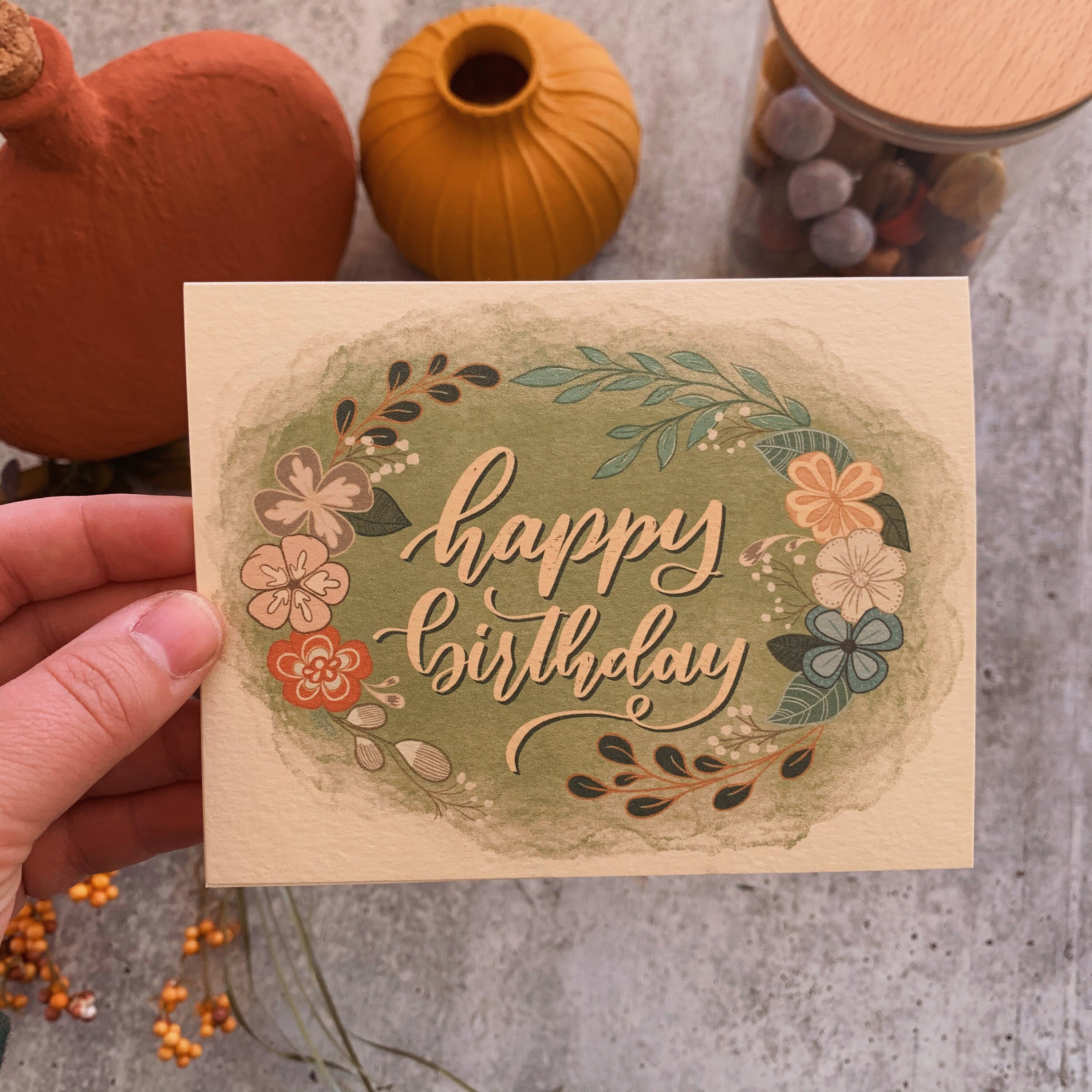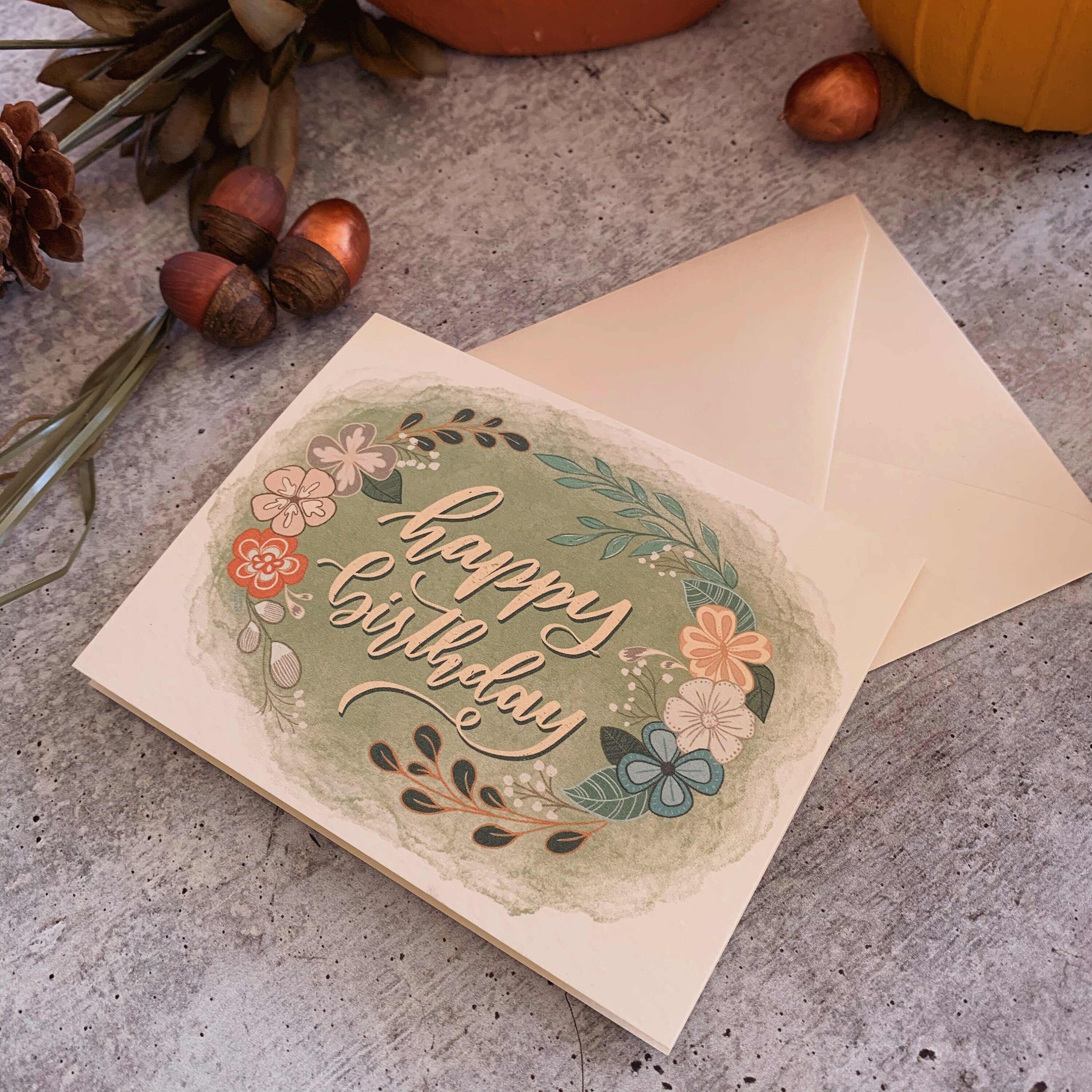 Happy Birthday Greeting Card, Script Lettering, Floral A2 Card with Envelope