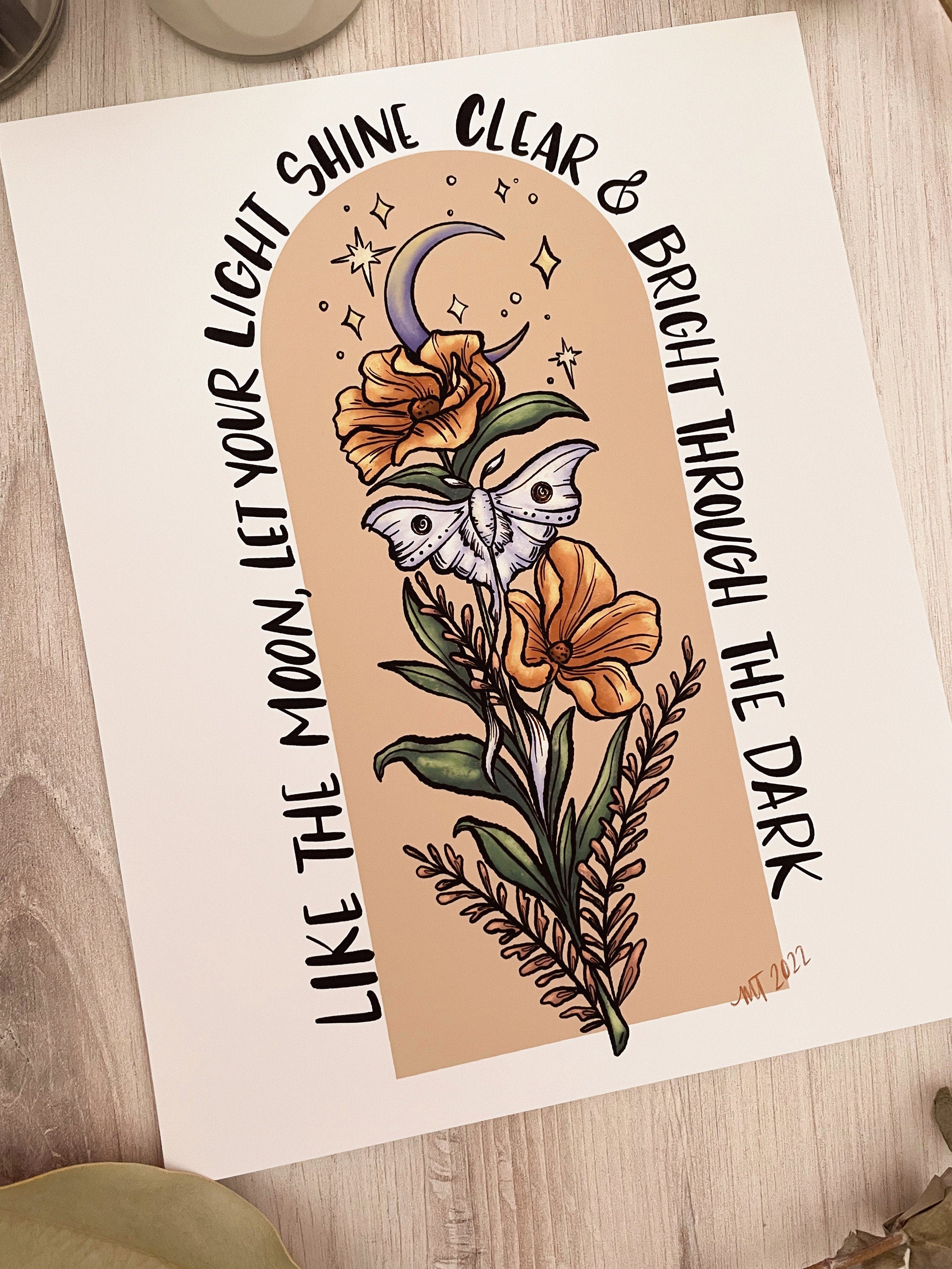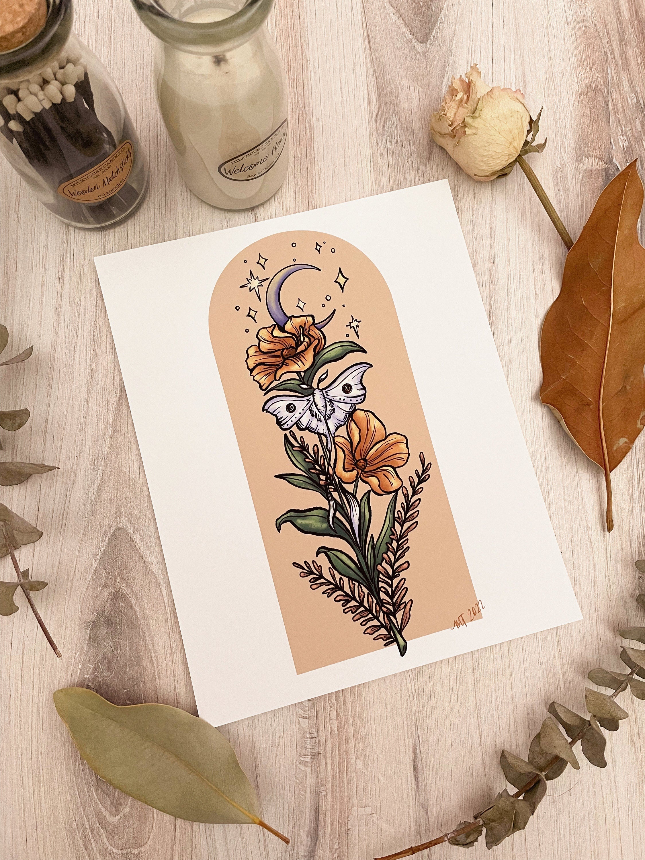 Poppy Moth & Moon Art Print, Witchy Moth Artwork