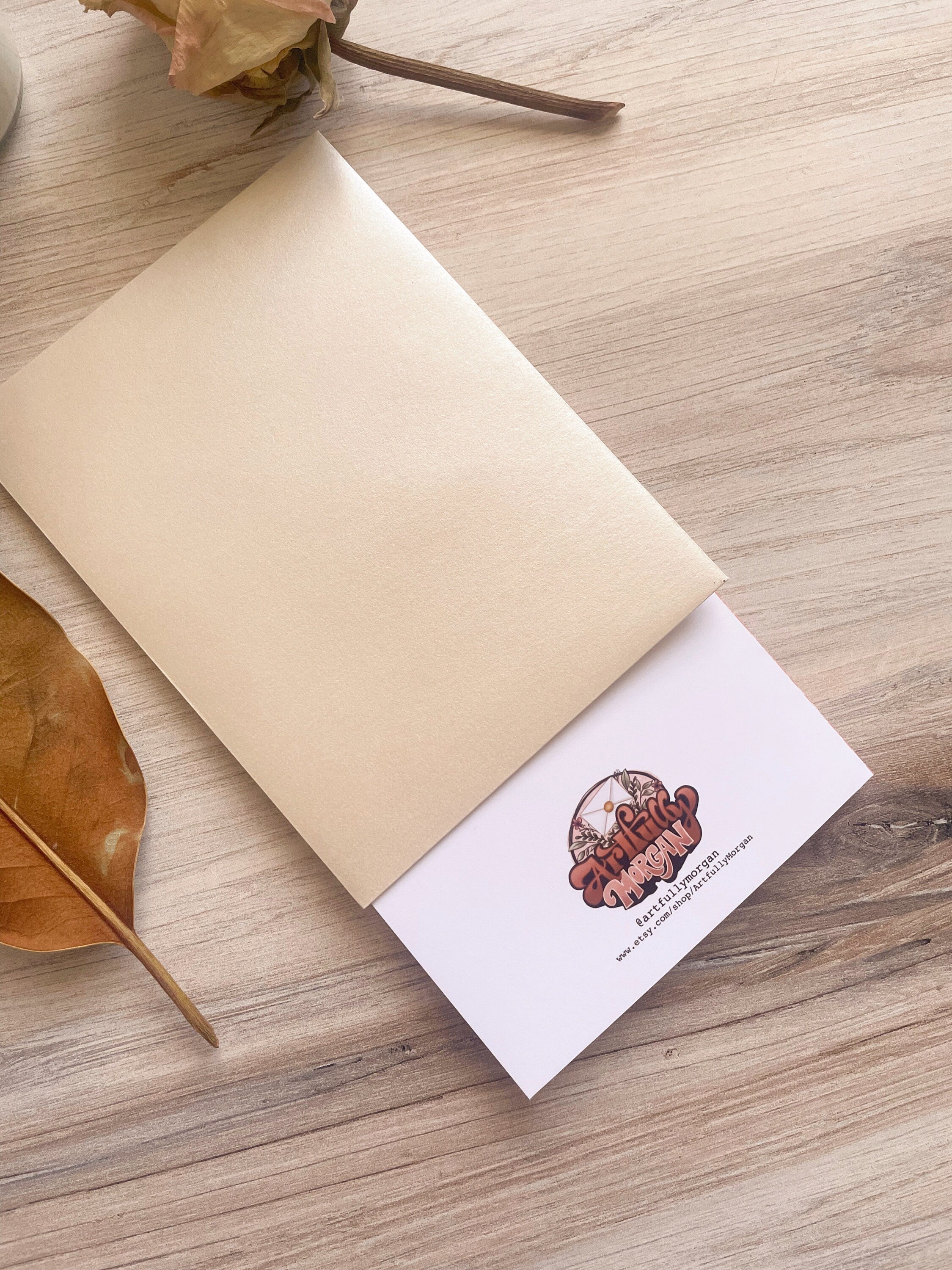 --This item was created by hand using Procreate and then printed onto a bright white, high-quality, ultra-matte 230 GSM paper. The design is Inkjet printed and hand-cut & folded to size. The envelope is an opalescent metallic white/cream color. The card is blank on the inside and is A2 in size.