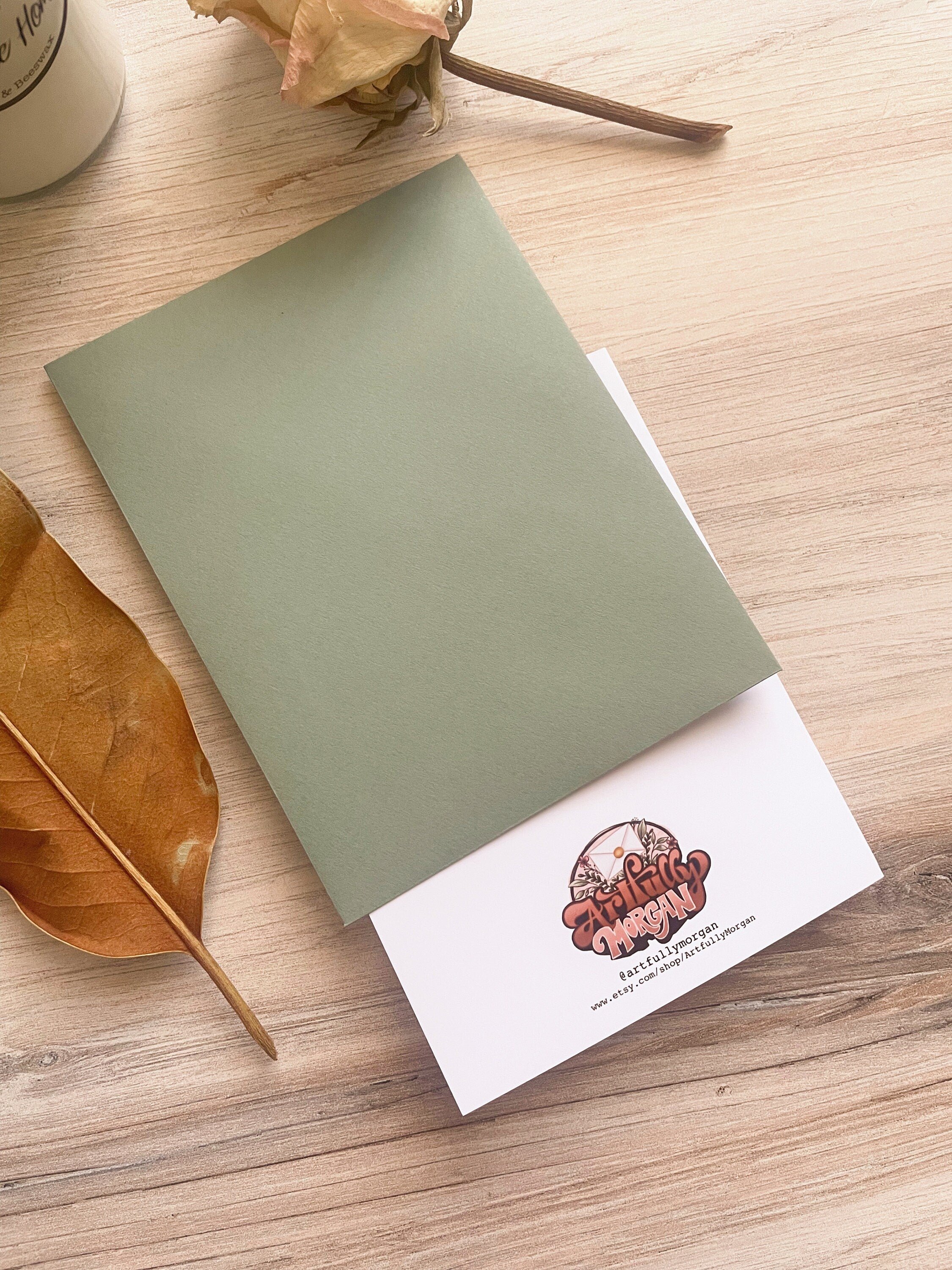 --This item was created by hand using Procreate and then printed onto a bright white, high-quality, ultra-matte 230 GSM paper. The design is Inkjet printed and hand-cut & folded to size. The envelope is a matte eucalyptus green color. The card is blank on the inside and is A2 in size.