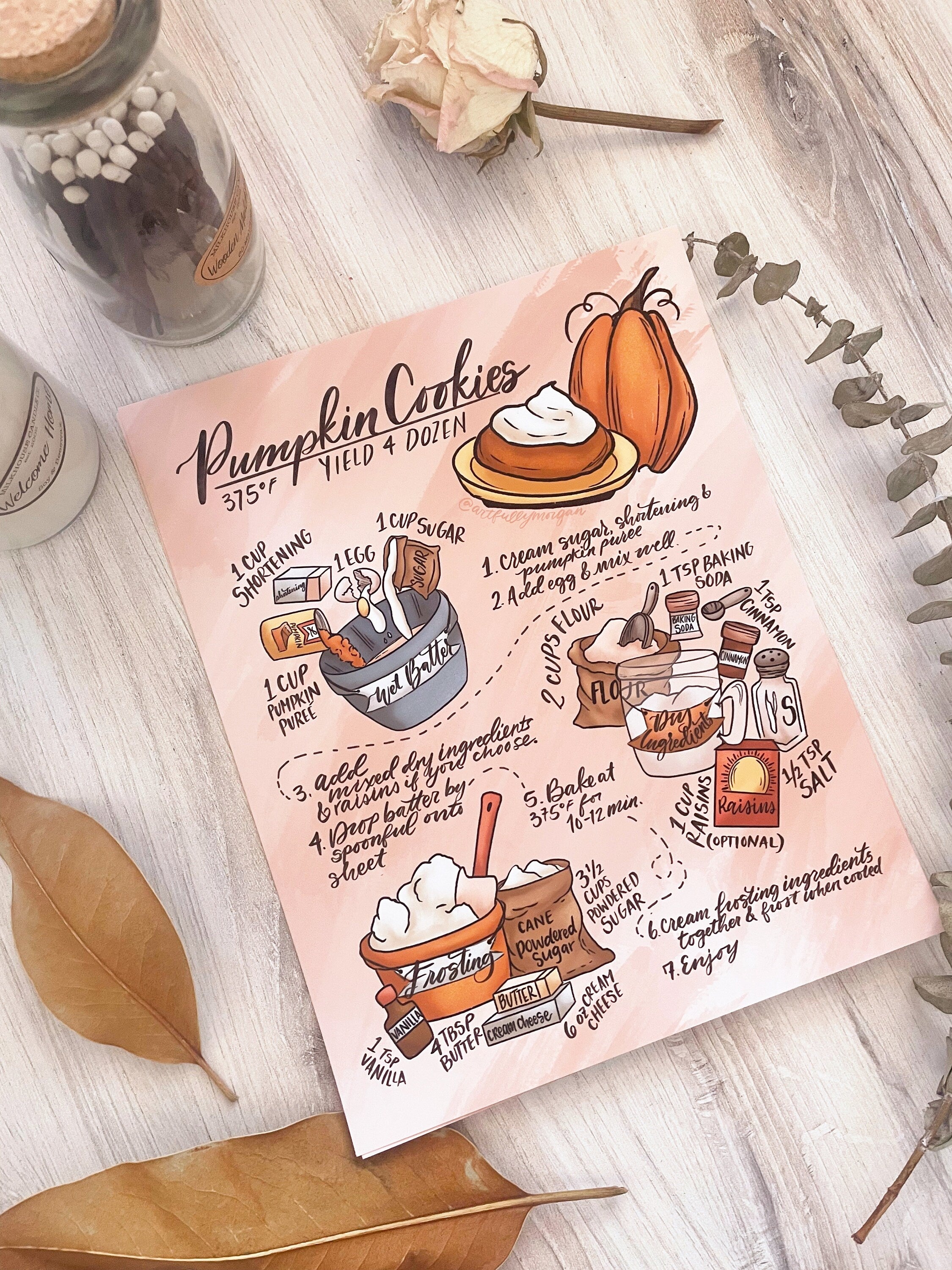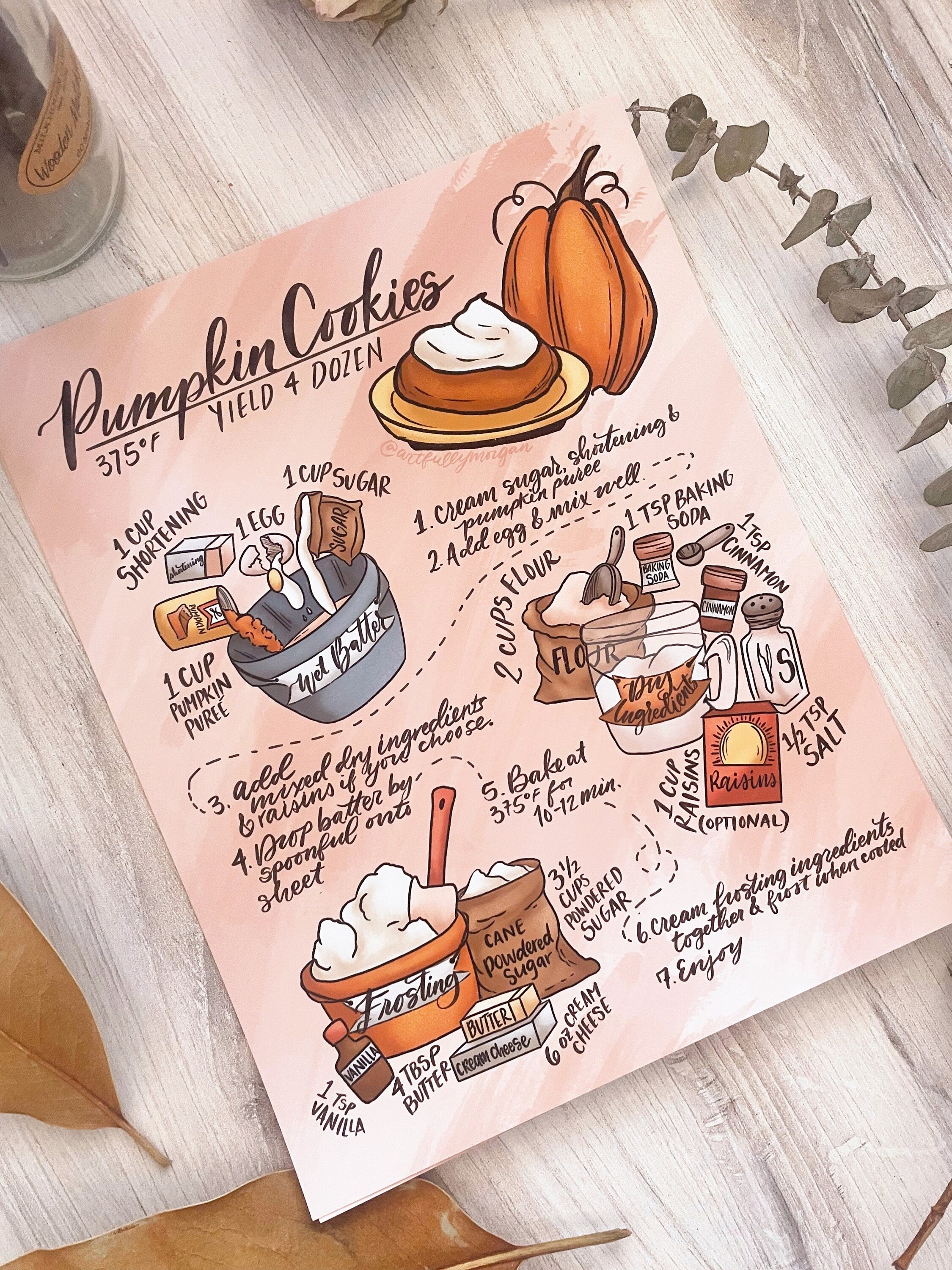 --This listing is for one 5x7 or 8x10 11x14 Pumpkin Cookie art print. This really is a recipe, and they really are delicious.