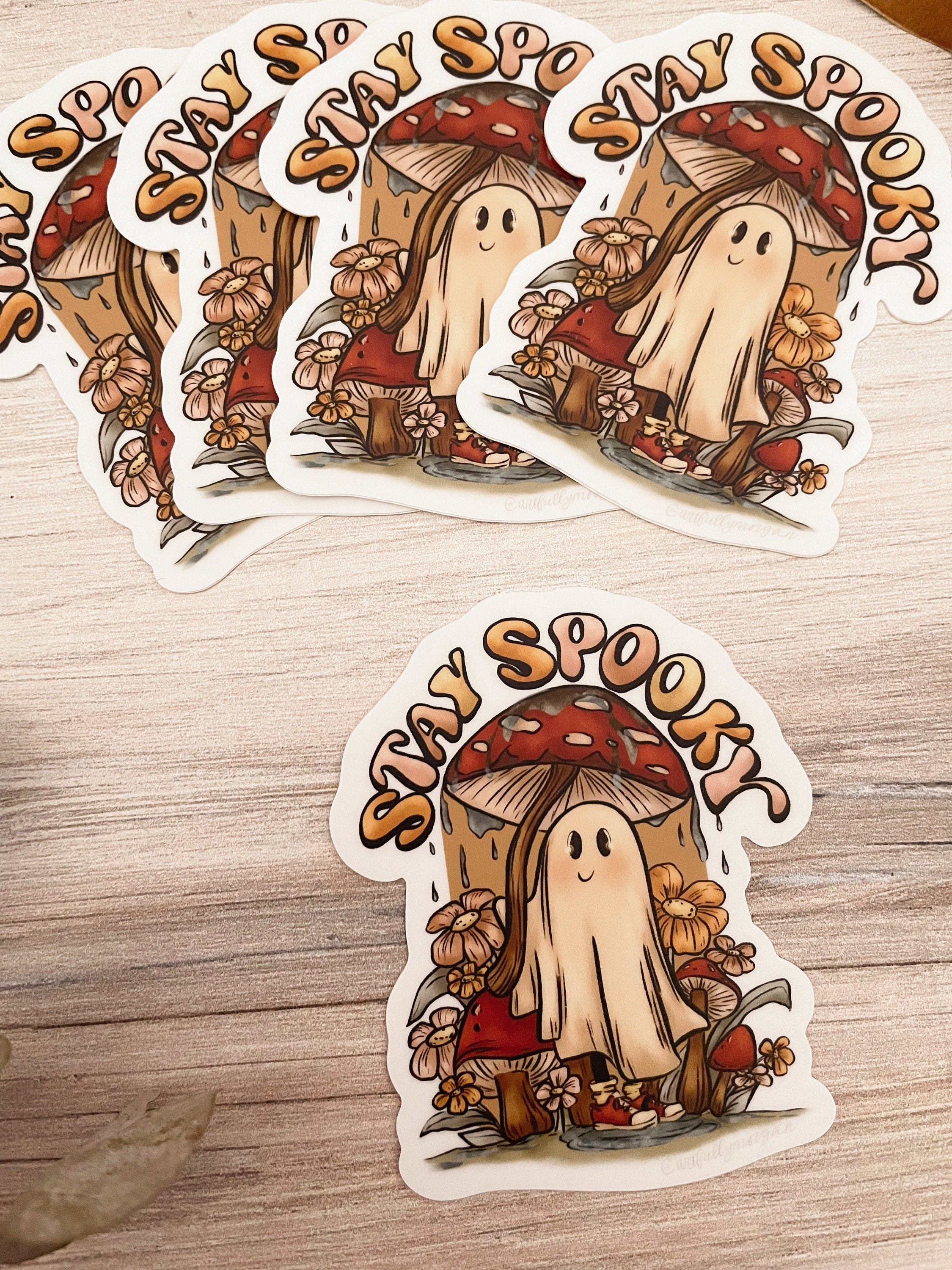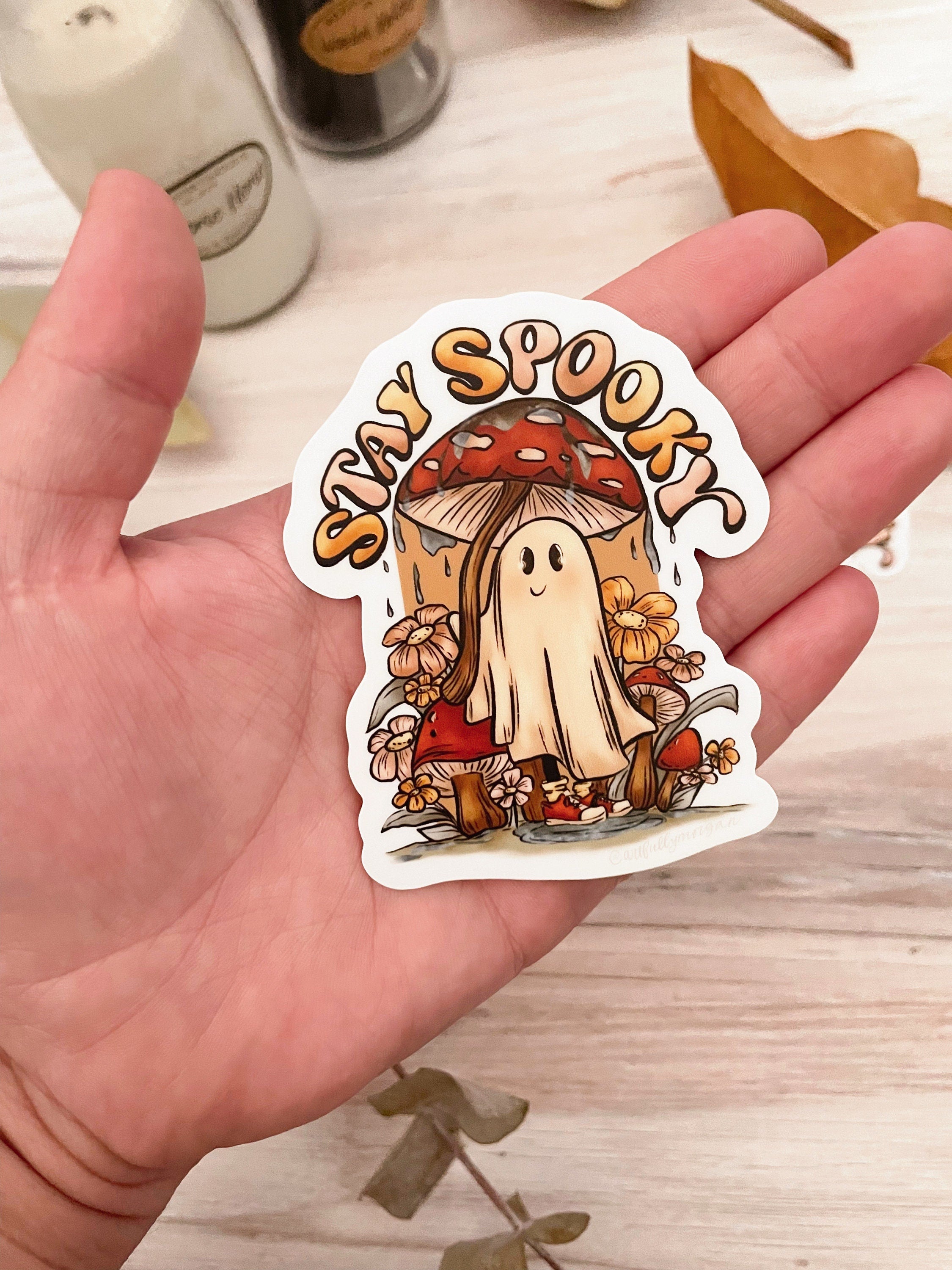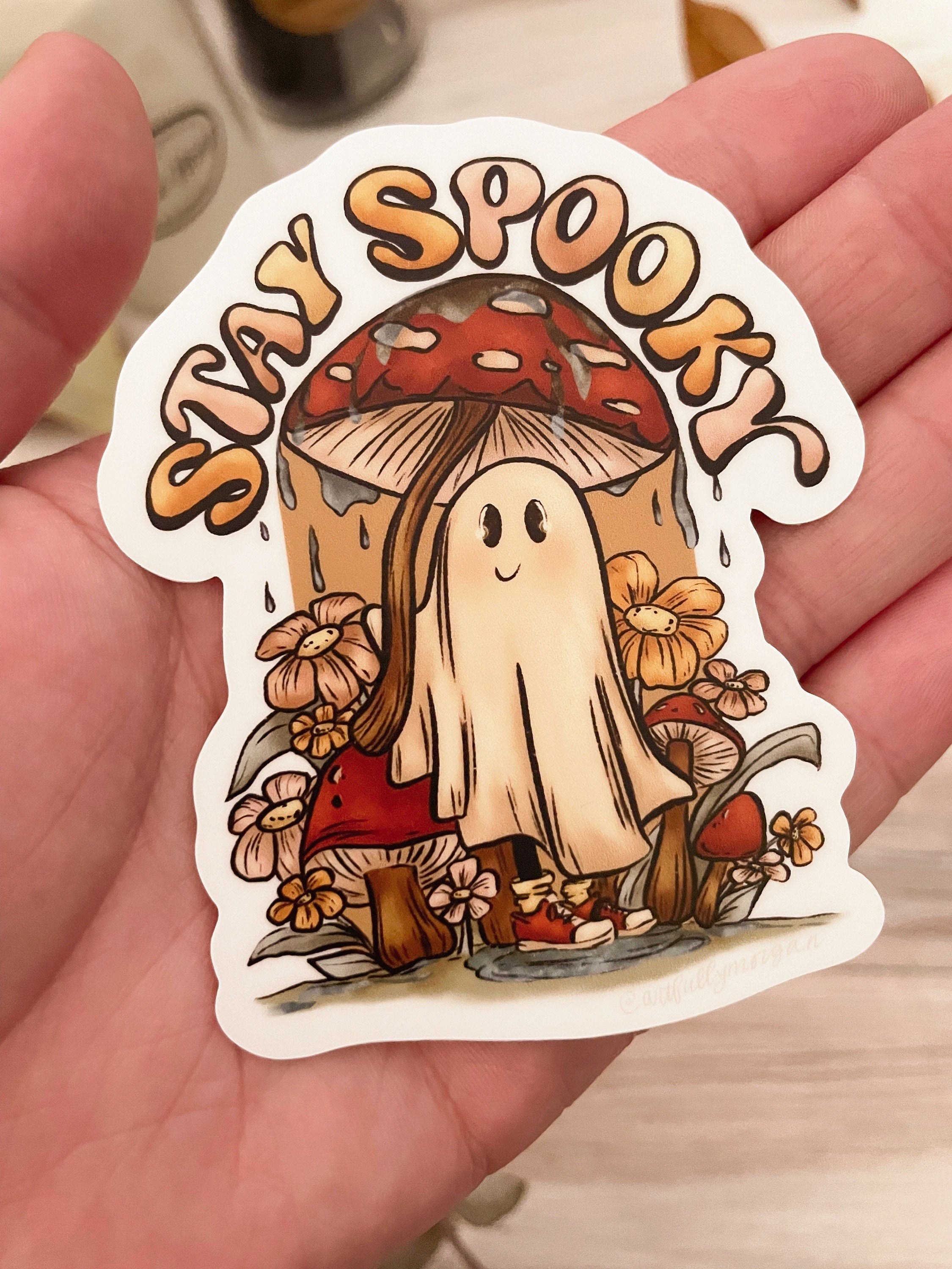 --This listing is for a single "Stay Spooky" Sticker. A groovy little ghostie with a mushroom umbrella? Can you think of anything more fall?