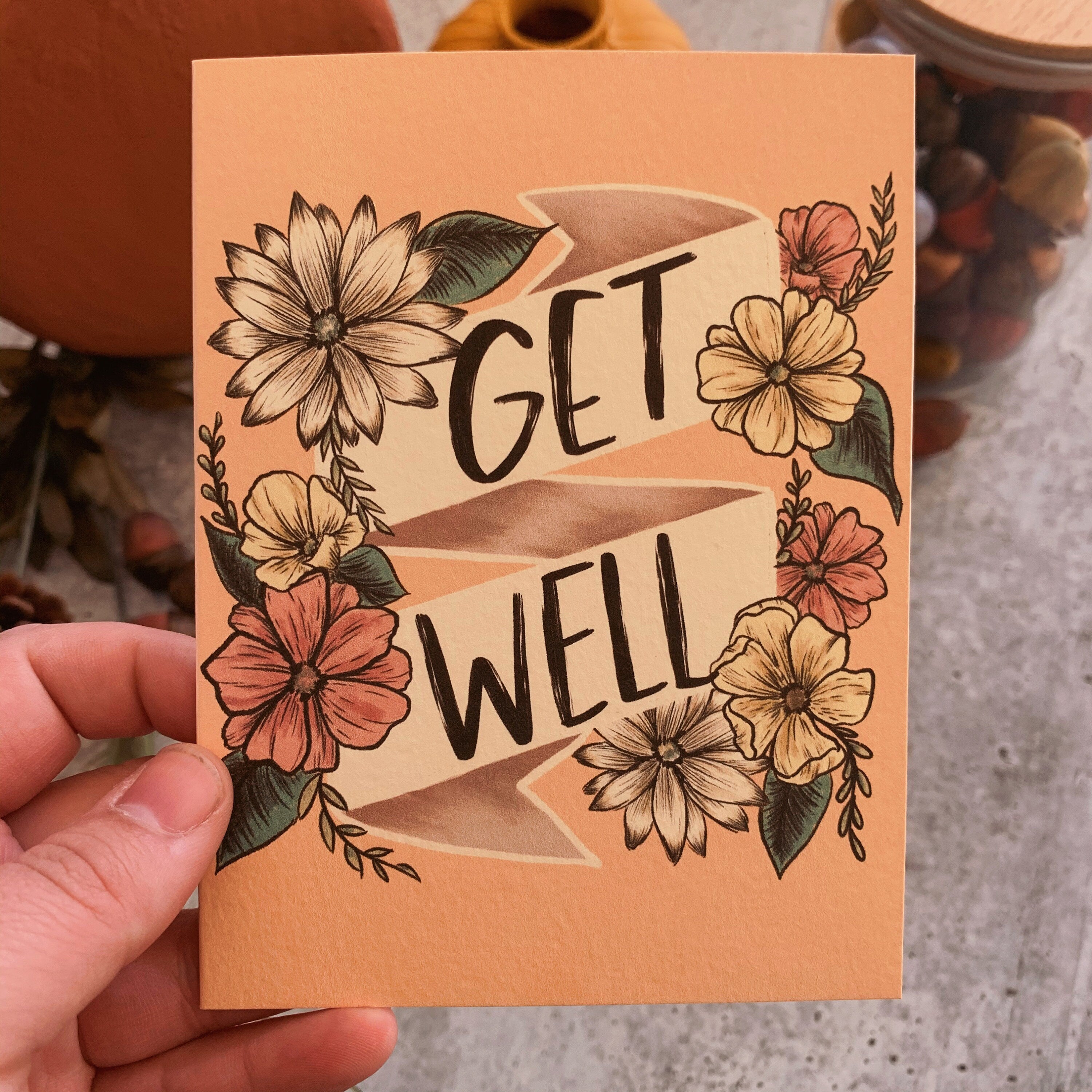 --This listing is for a single greeting card with the "Get Well" design. This card is colorful, bold & delightfully floral. Would definitely brighten someone's day if they aren't feeling their best.