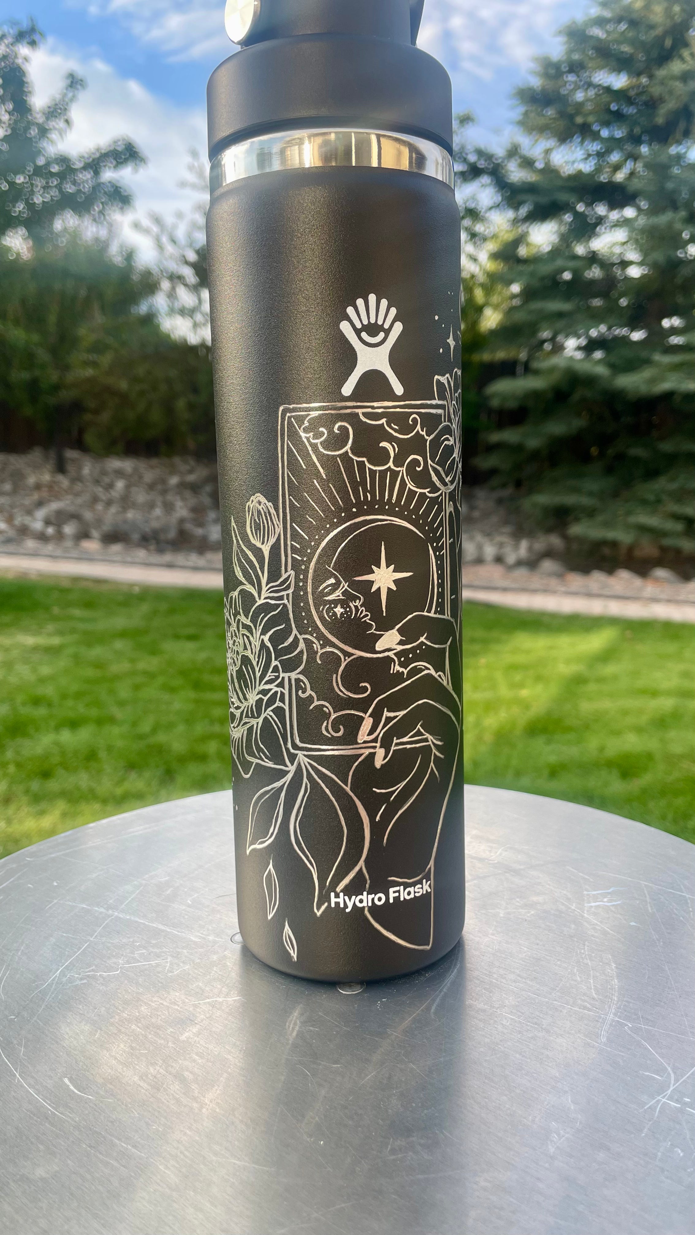 This listing is for a hand-engraved "The Moon Tarot" 24 Oz Hydro Flask Wide Flex Chug Cap Bottle. The bottle is black.