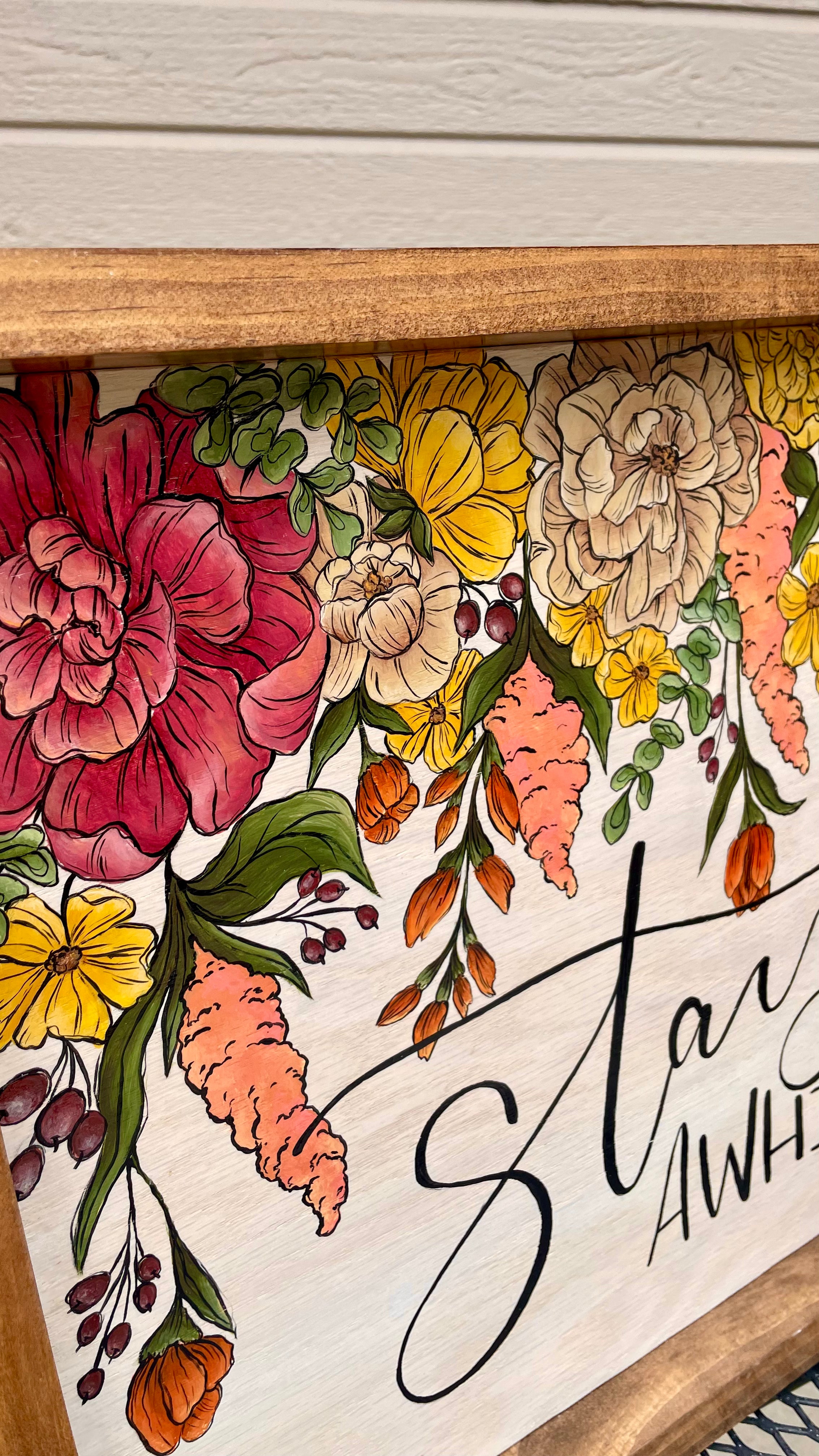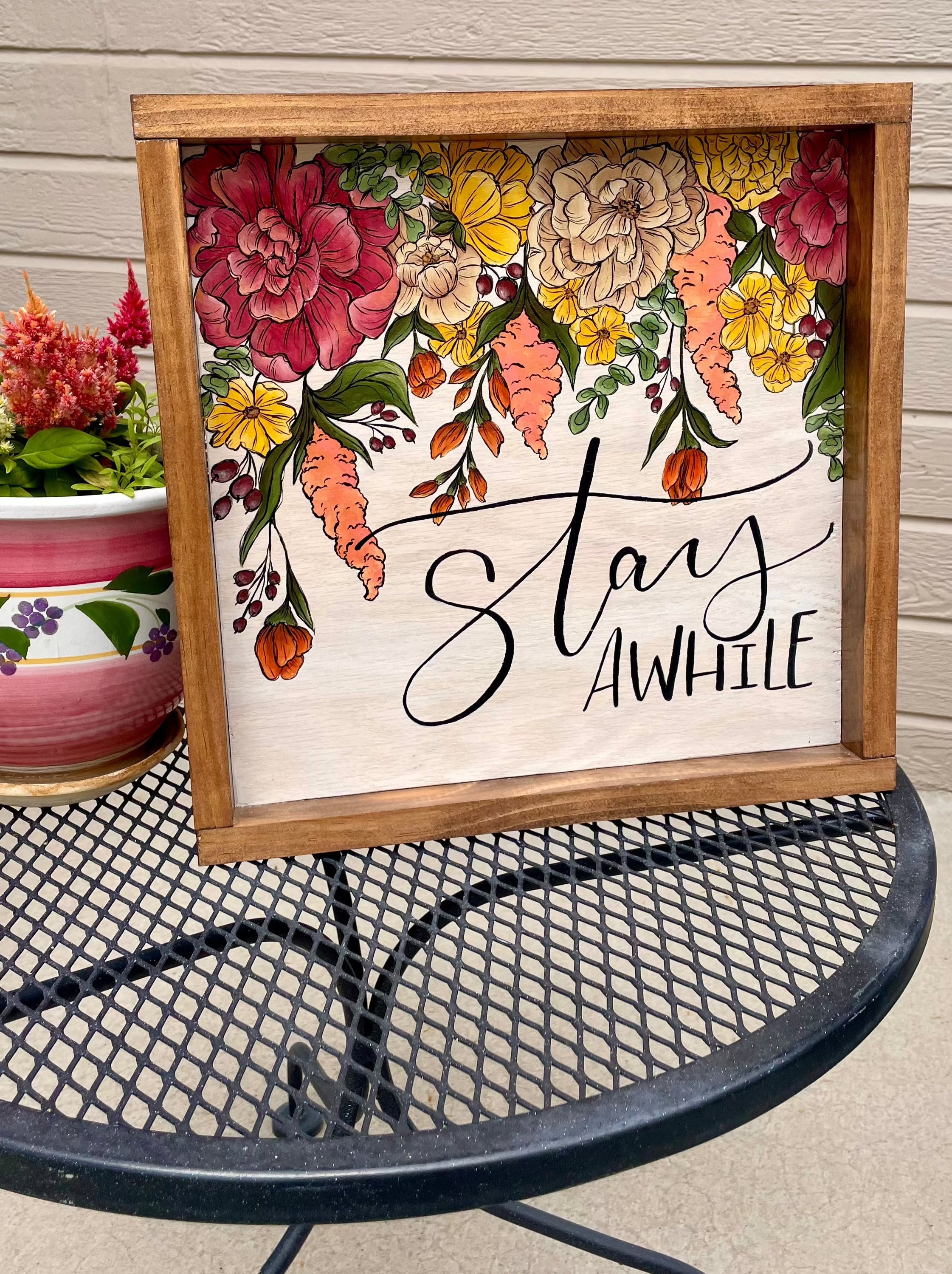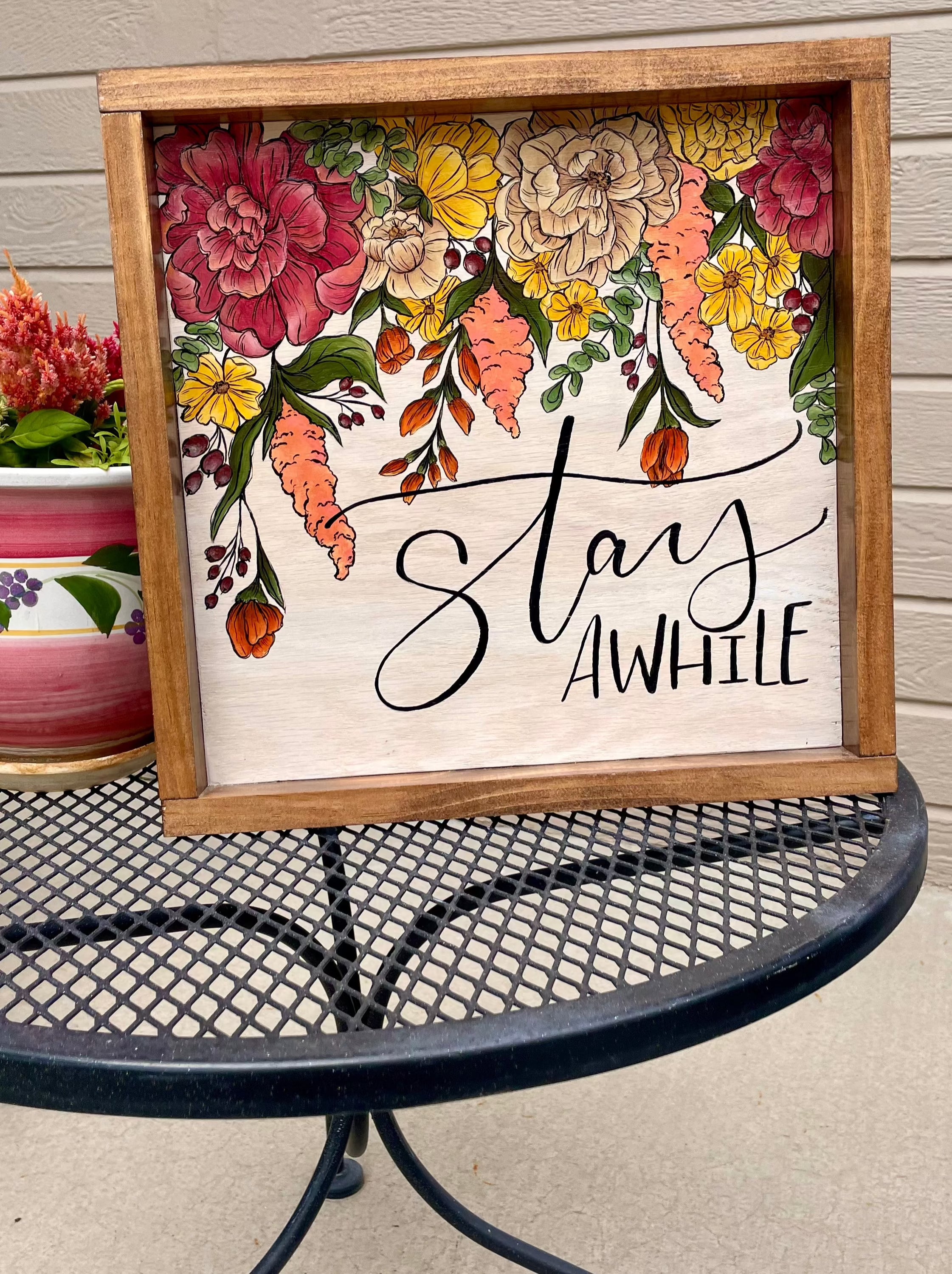 This listing is for a single hand-painted "Stay Awhile" floral hanging wooden sign.