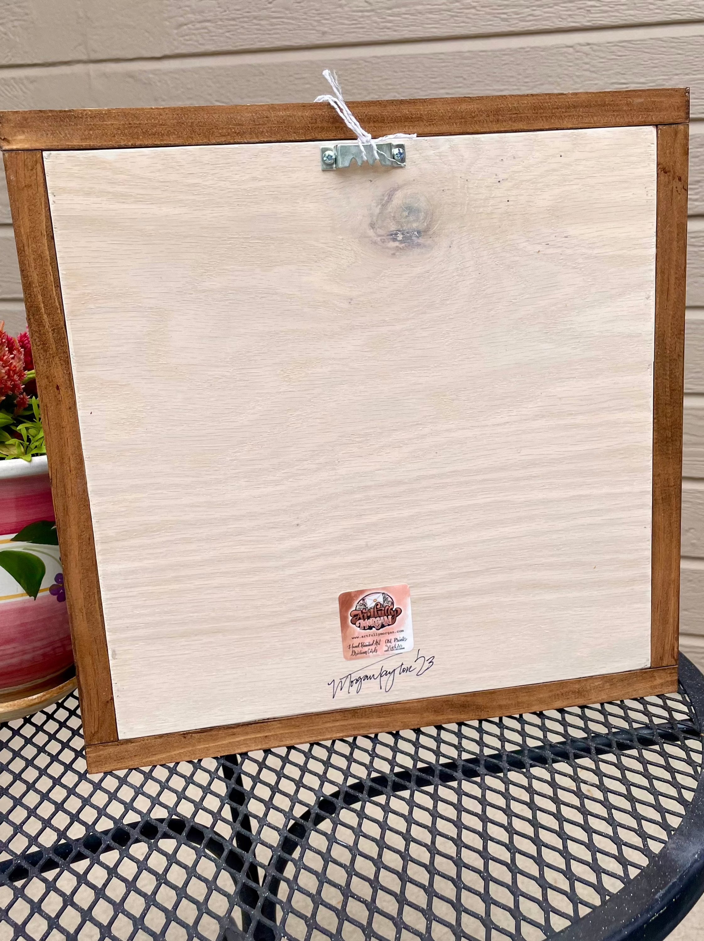 This sign was created using a white-washed oakwood for the main backer, and then a chunky pine for the frame. The wood was cut, painted and stained by hand and the design was also painted by hand using acrylic paint. The entirety of the sign has been coated with a protective polycrylic clear coat semi-gloss. The item comes with a heavy duty saw-tooth hanging material affixed.