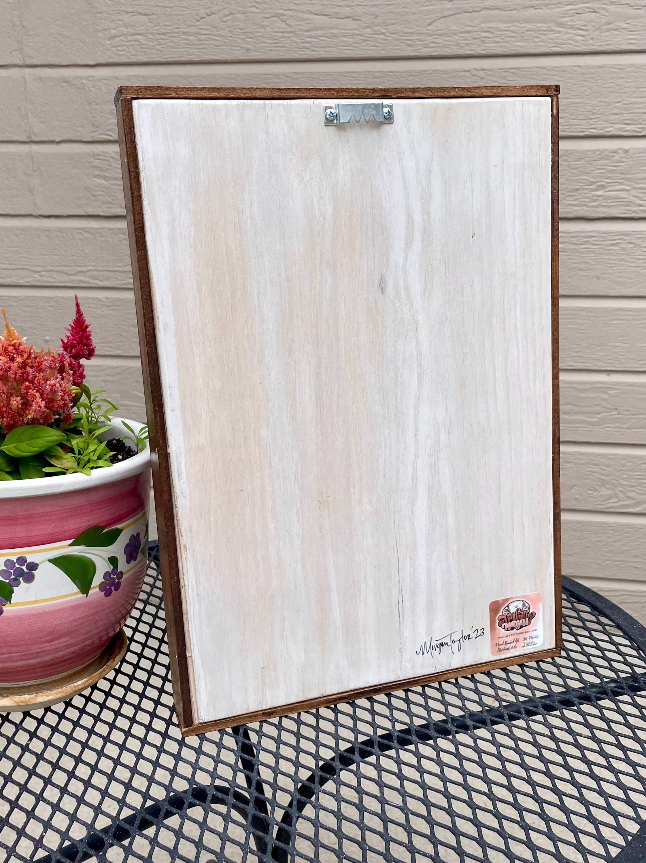 This sign was created using a white-washed oakwood for the main backer, and then a skinny oak for the frame. The wood was cut, painted and stained by hand and the design was also painted by hand using acrylic paint.