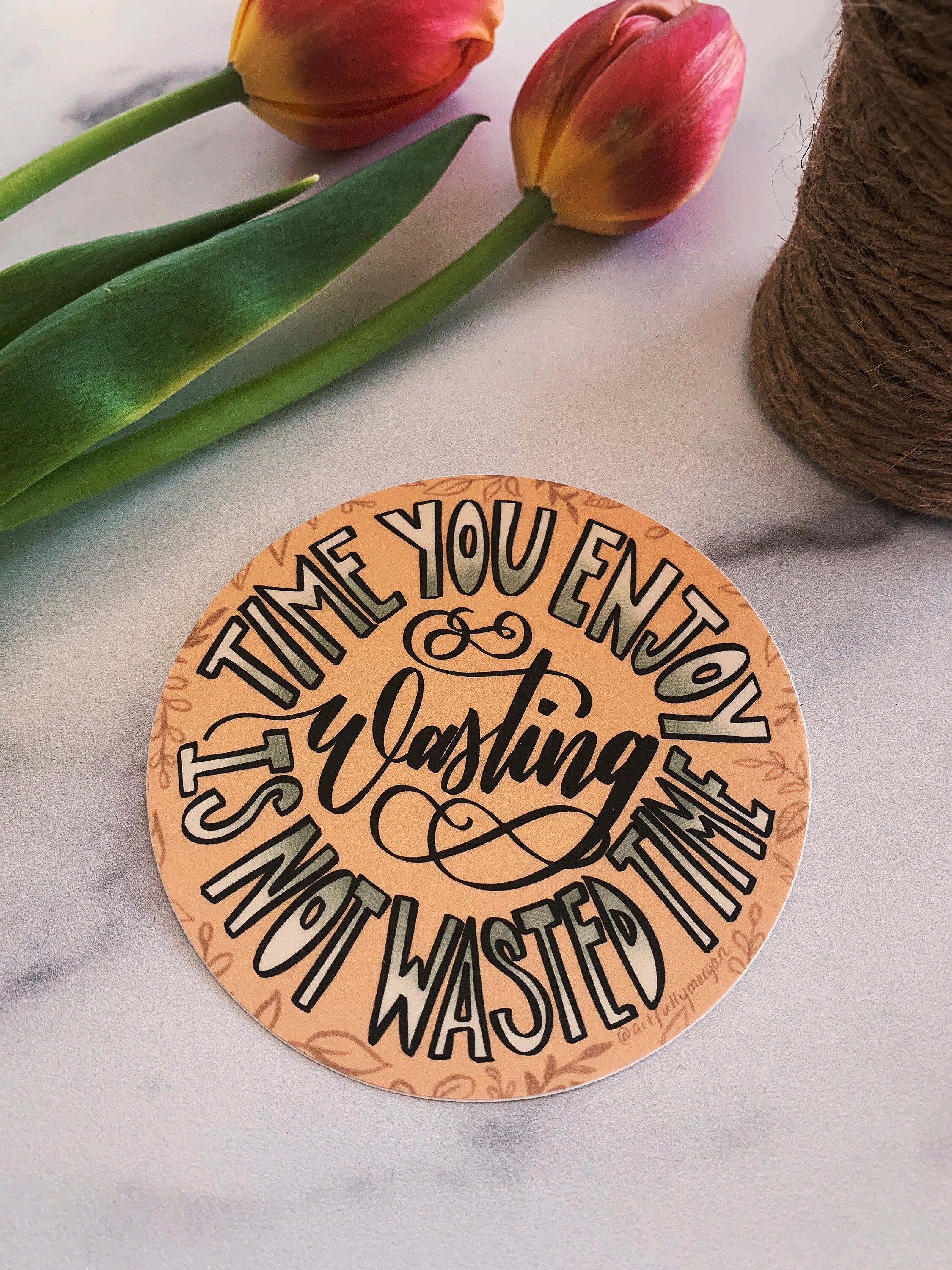--This listing is for a single "Time You Enjoy Wasting is Not Wasted Time" sticker. There are small floral line art elements around the edges.