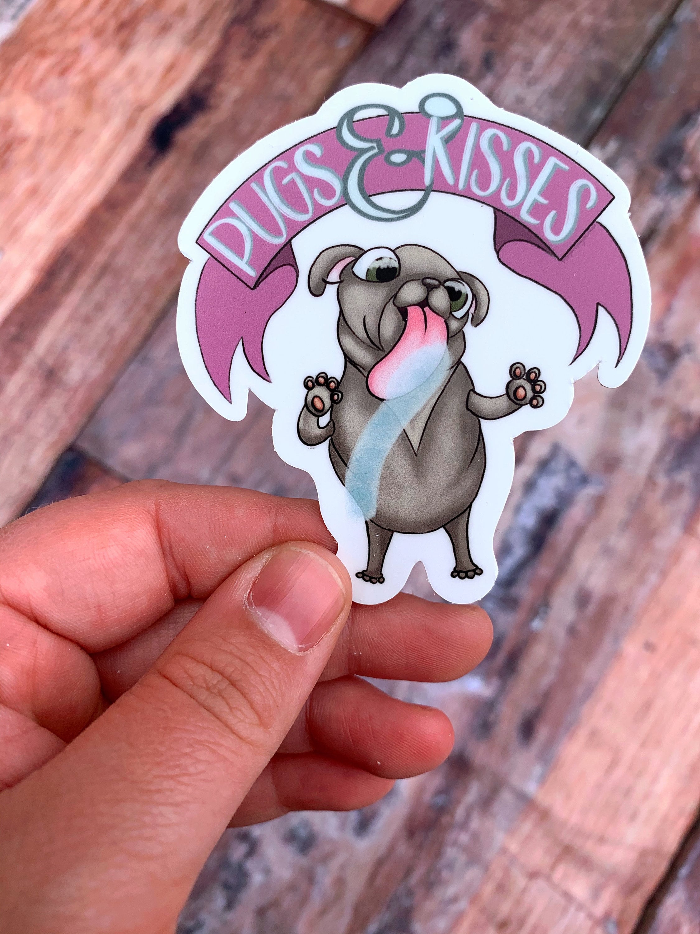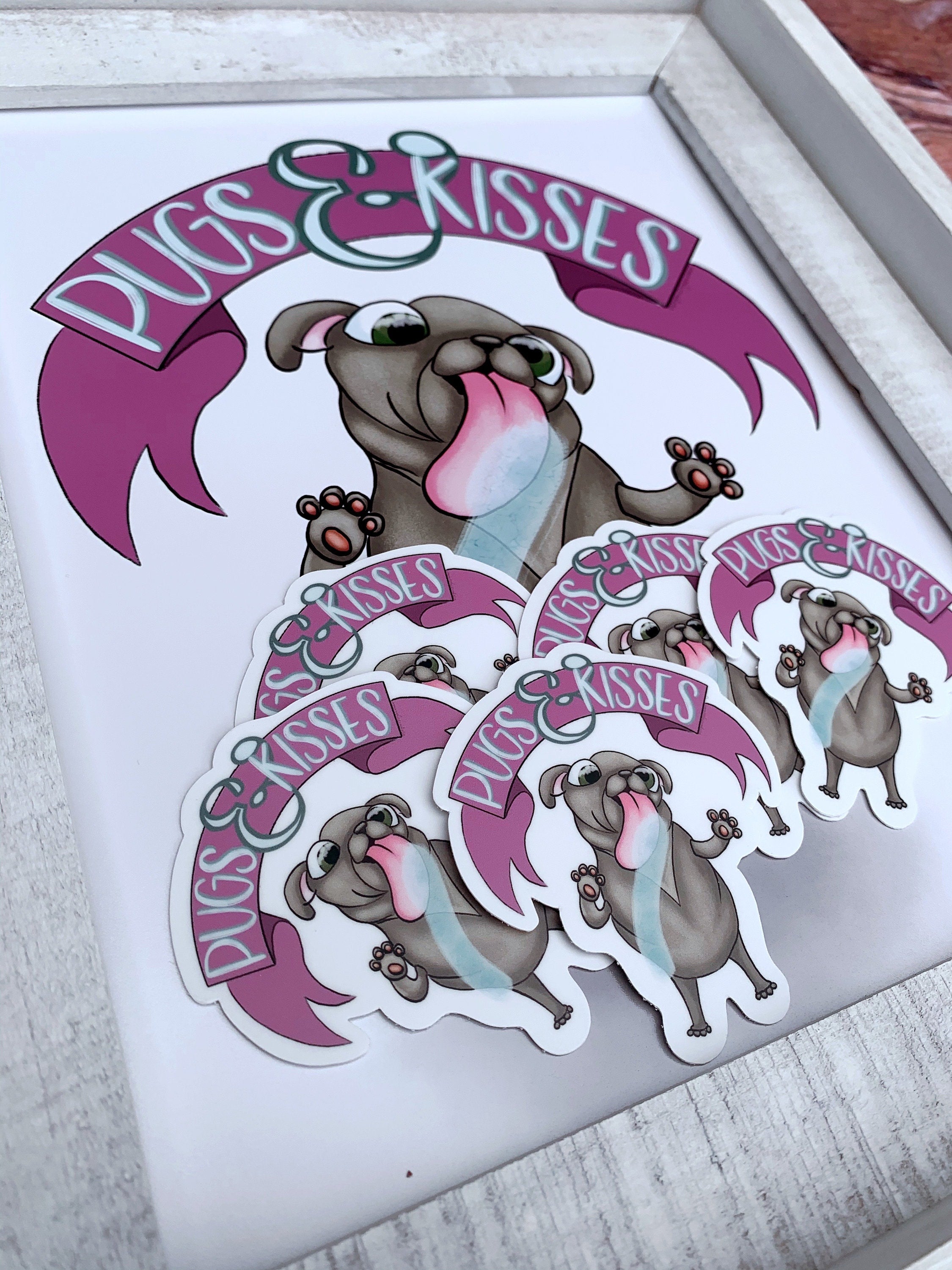 Pugs & Kisses Sticker, Pug Pun Artwork, Vinyl Pug Sticker, Funny Pug Artwork