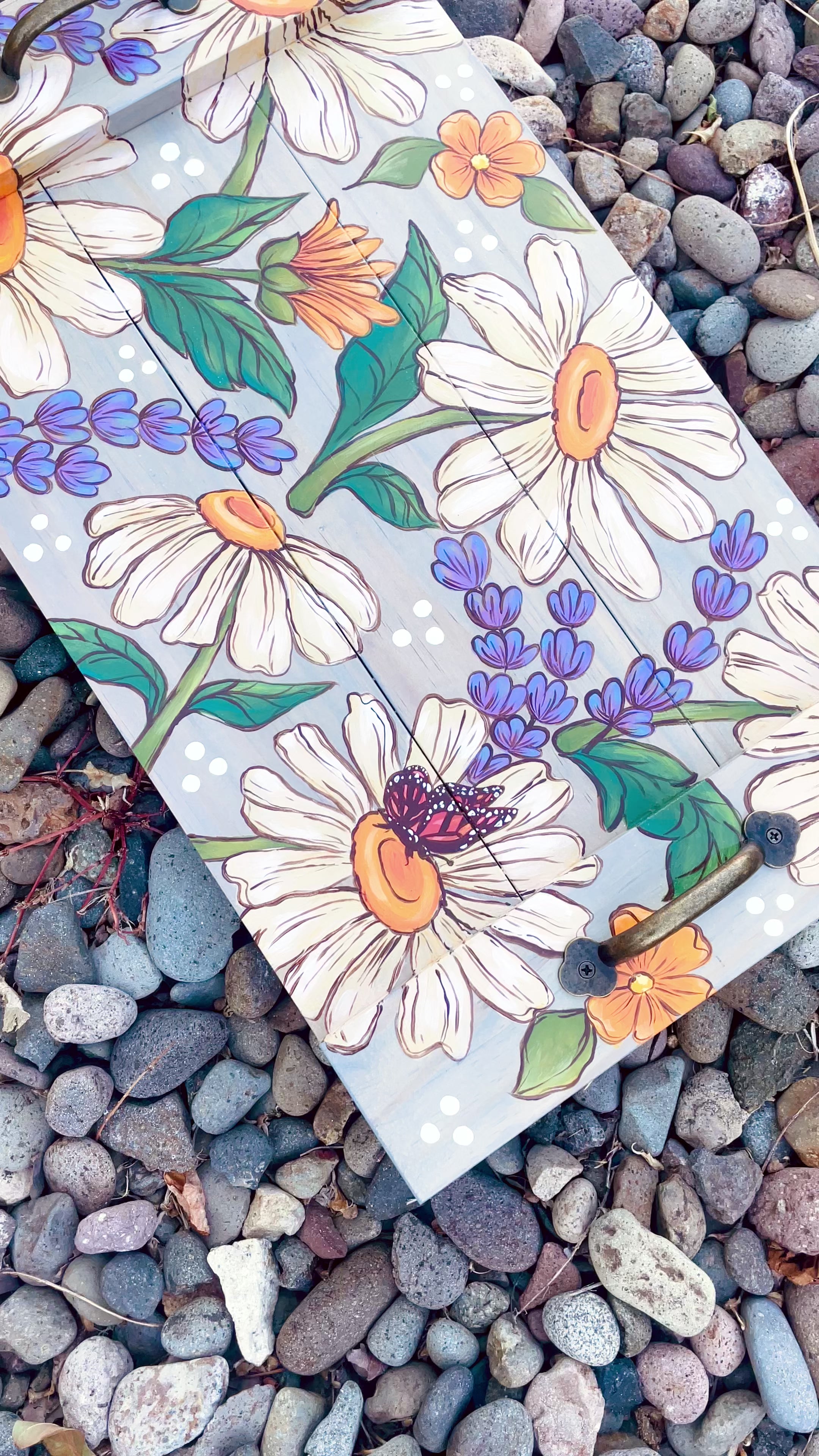 Daisy and Lavender Hand-Painted Coffee Table Tray, Whimsical Floral Art