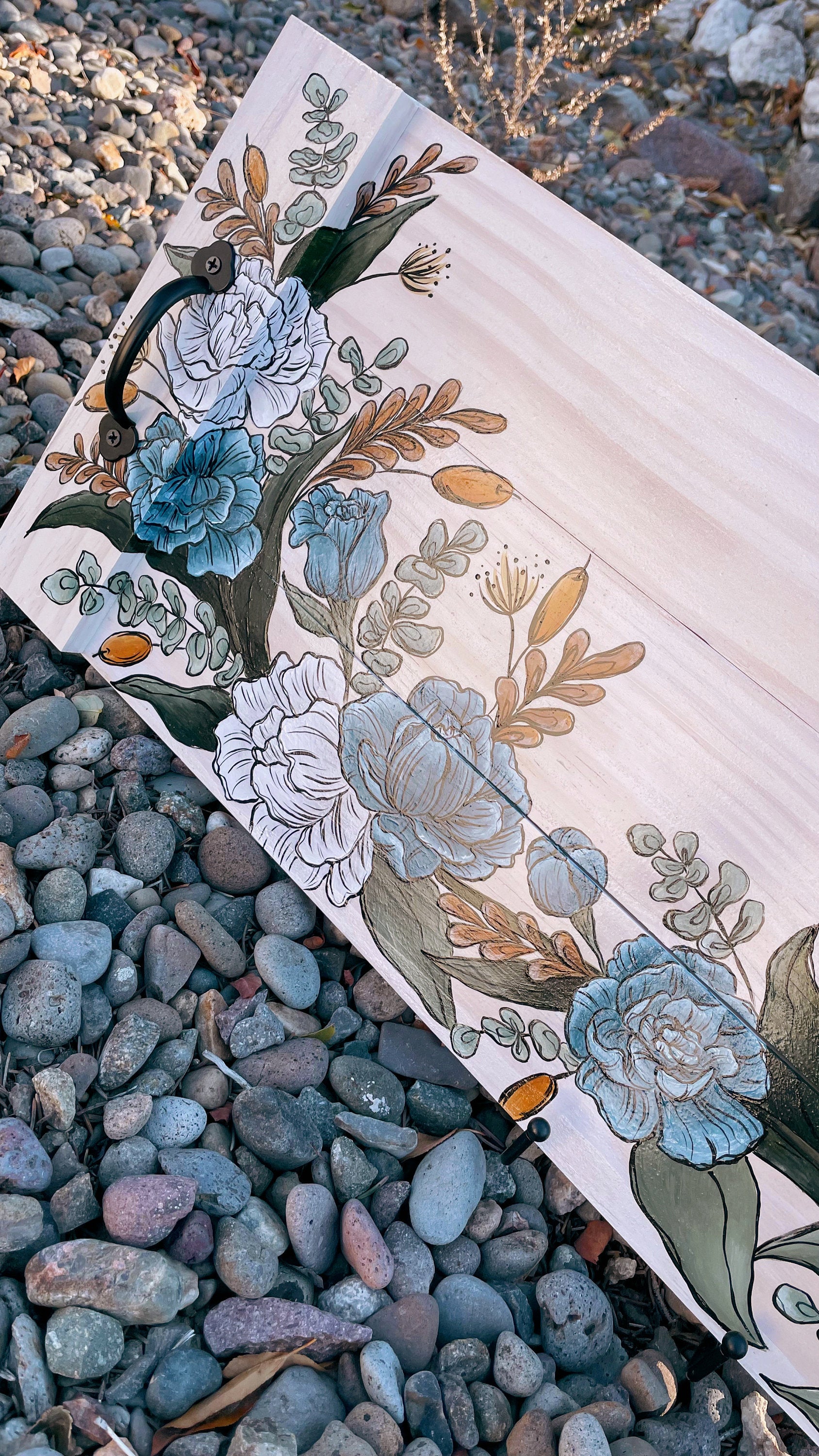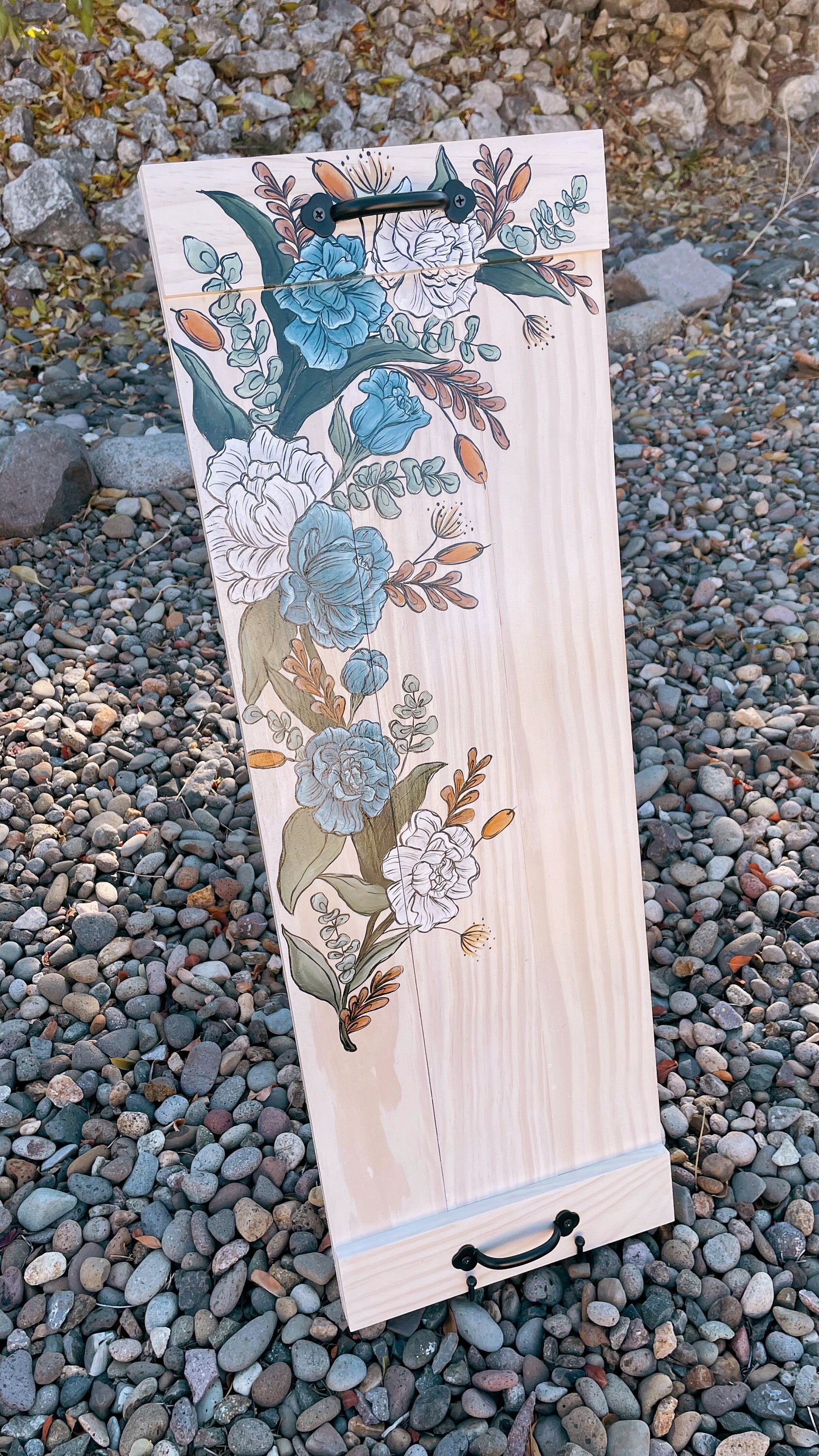 This listing is for one hand-built and painted coffee table tray. The design was painted with high-quality acrylic paints, and the entire item was finished with a polycrylic clear coating. The wood is a solid pine and it was hand-stained and assembled.