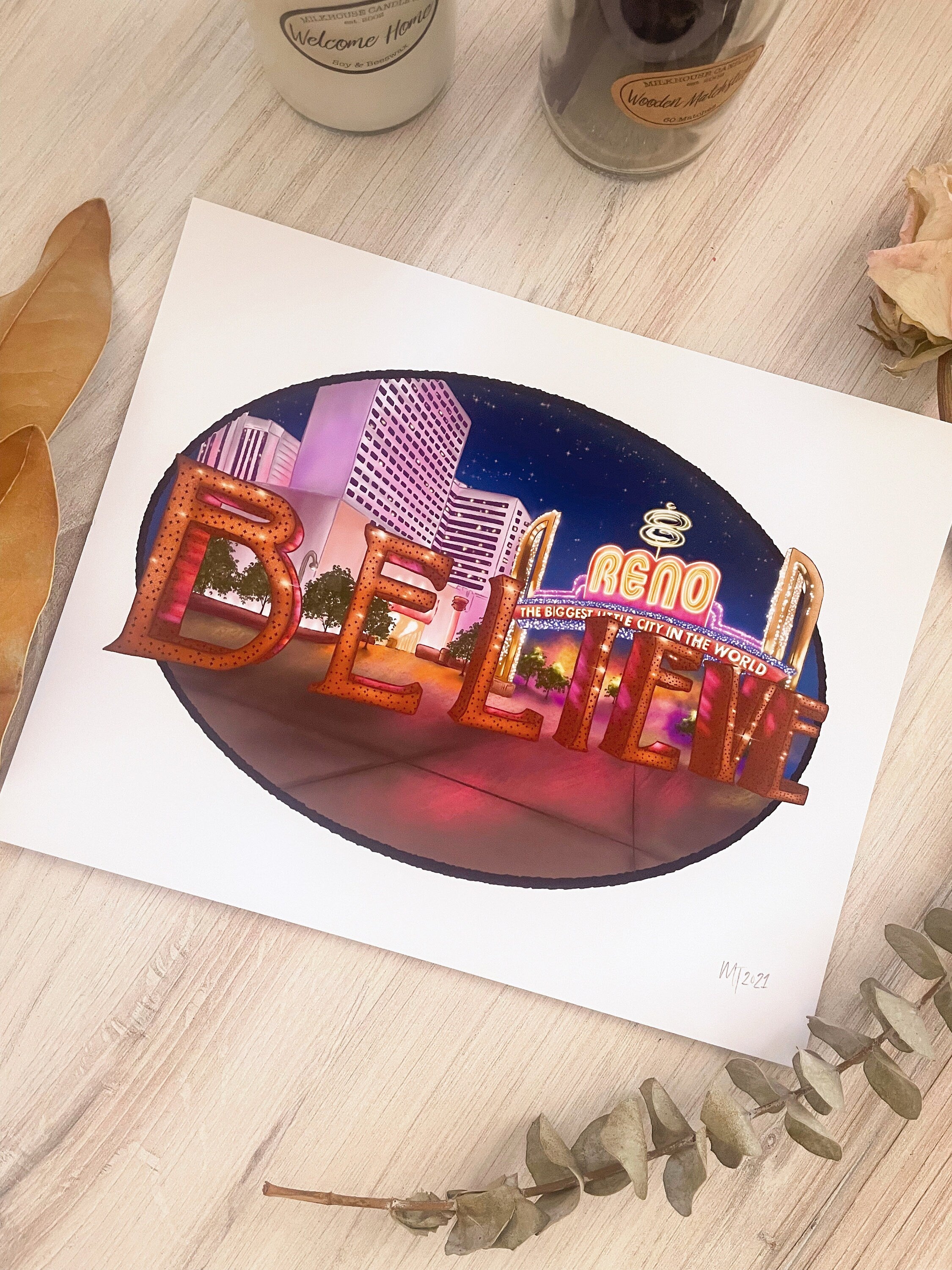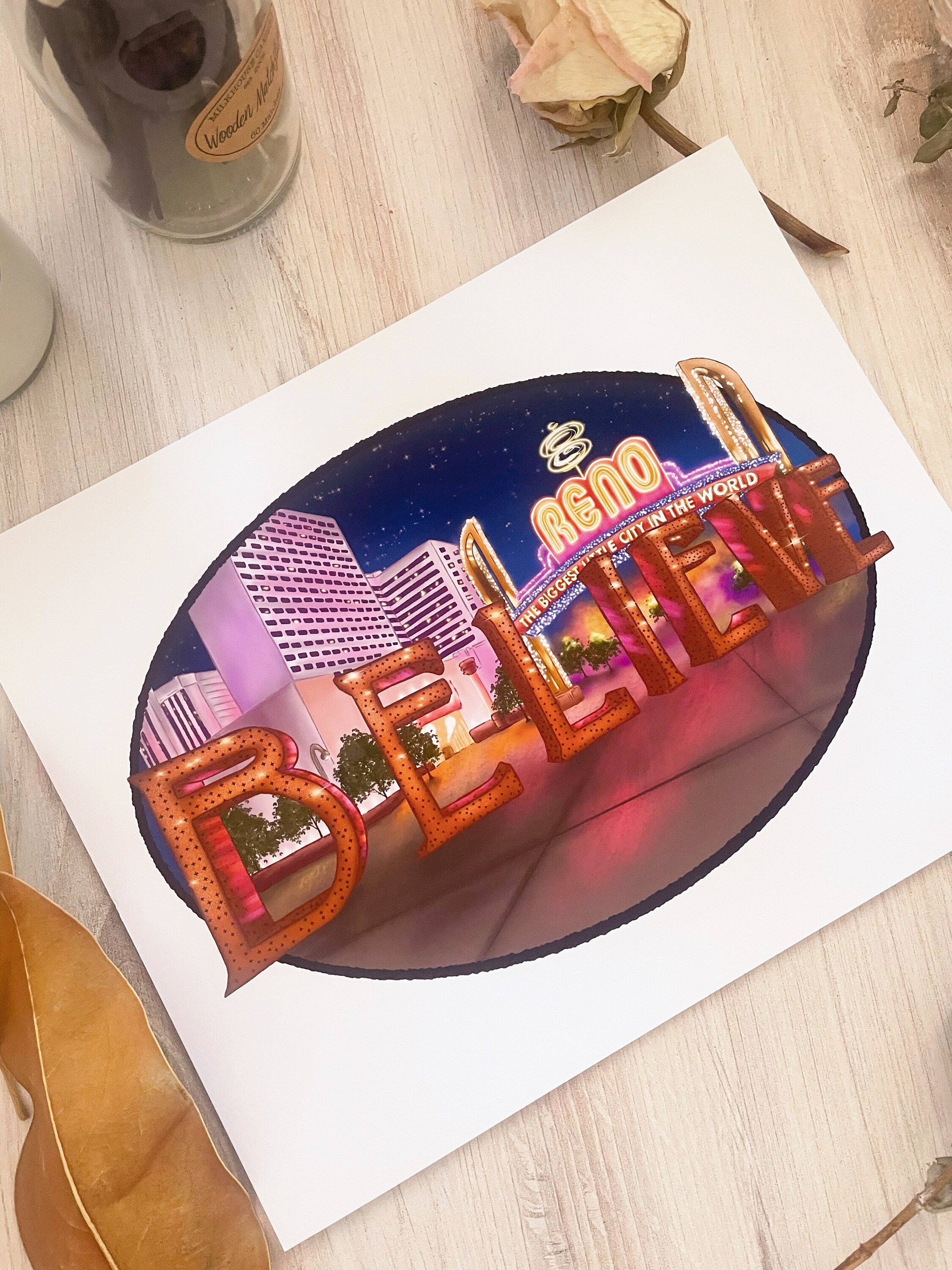 --This listing is for one 5x7 or 8x10 11x14 Believe Reno Nevada art print. This art piece represents downtown Reno, neon lights and all!