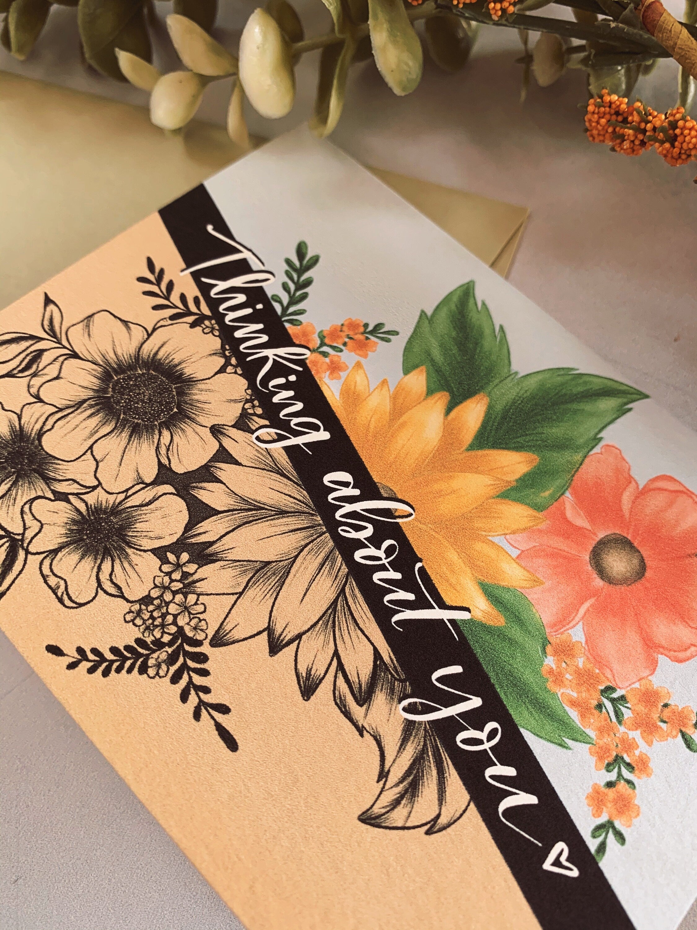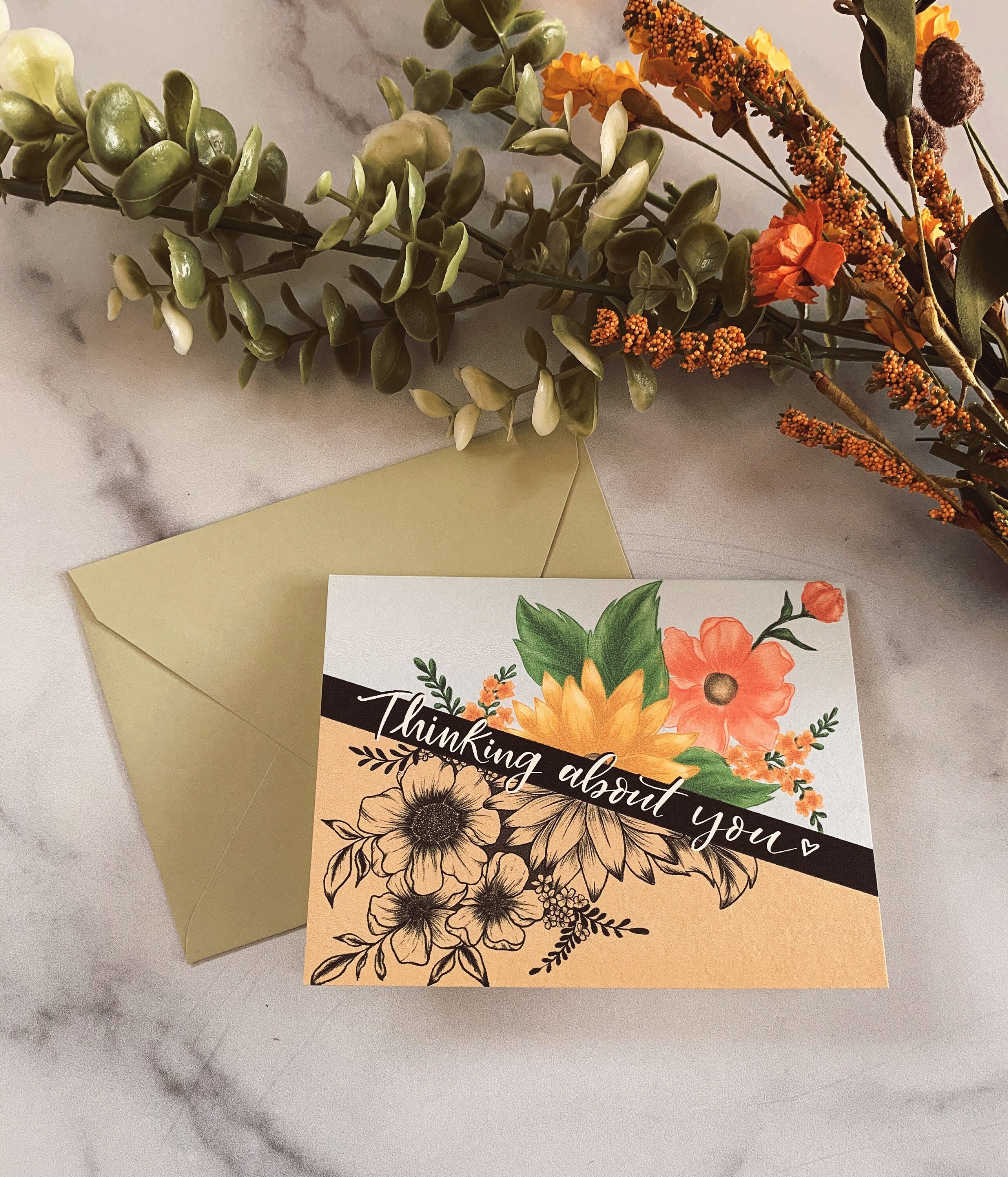 --This listing is for a single greeting card with the floral "Thinking of You" design!