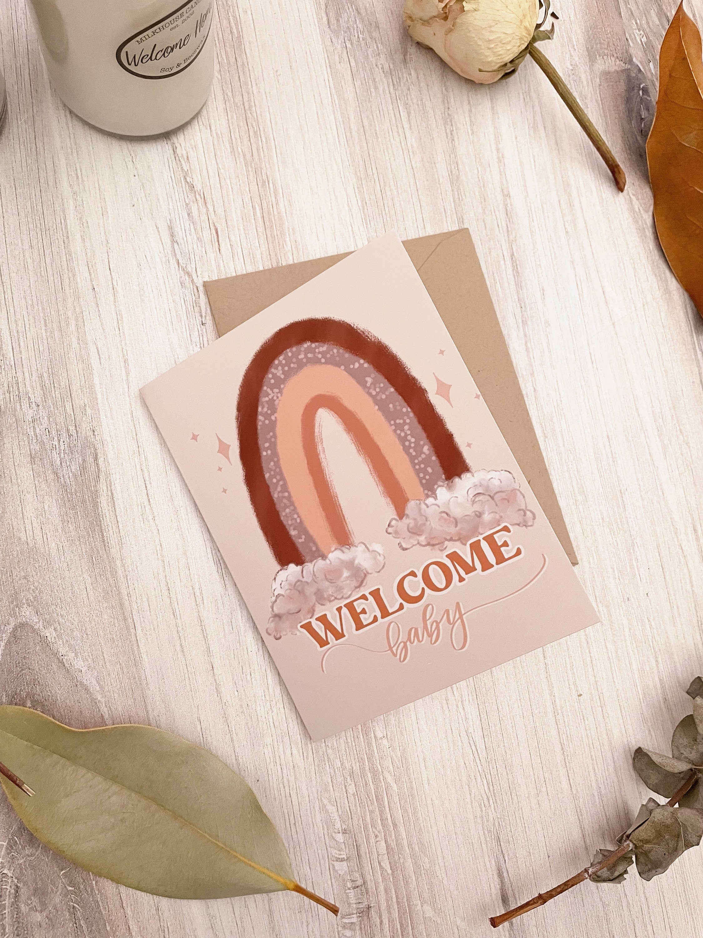 --This listing is for a single greeting card with the "Welcome Baby" rainbow design! This sweet boho design is totally perfect for those trendy soon-to-be moms in your life!